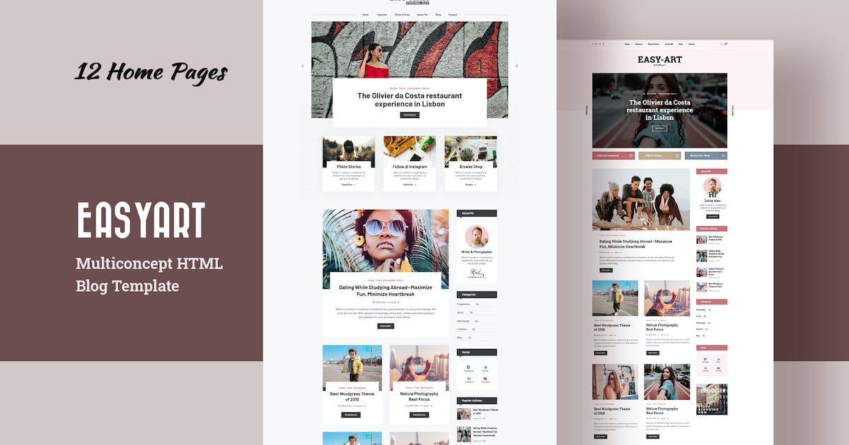 EasyArt – A Bootstrap 4 based Creative Portfolio HTML5 Template for All kind of Blog, Magazine, personal blog and Corporate blogsites HTML5 Template. EasyArt is a full-featured Blog/mag Template including 12 Home Variations. EasyArt is Responsive Designed Blog Template. It is Multi-Device supported & Cross Browser Compatible. Well Documented. Template Features Made by Professional. So it’s covered necessary design elements. Perfect Bootstrap 4 Elements. Multi Page Template. Creative Single Post pages. 12 Home Page Variations. Clean & Creative Design. Awesome Mega Menu. Clean and W3C validate the code. Made with SCSS. Instagram. Contact Form Ready. MailChimp Form Ready. Mobile First Design. All necessary Elements Included etc. Free Google Fonts. Font Awesome With SVG Icons. SASS Files included. Fully Responsive and Supported Multiple Modern Device like Mobile, Tablet, Desktop etc. All Modern Browser Supported. Modular CSS Block Styles & W3C Validated Code. Well Documented.