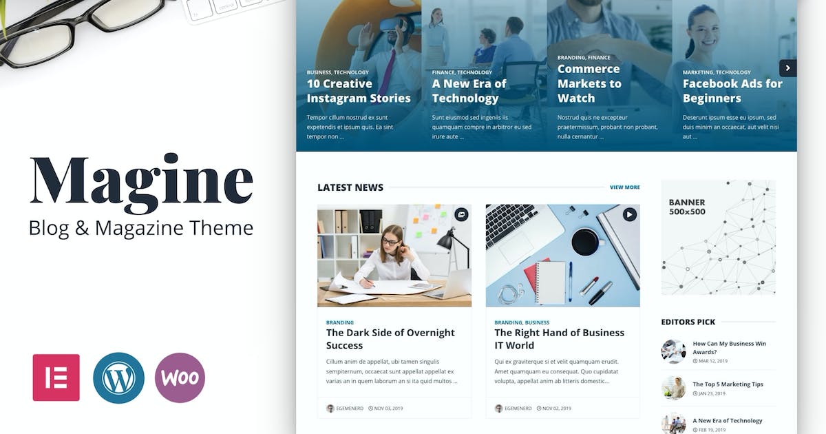 Magine is a modern WordPress news, magazine and blog theme specially designed for business blogs. Thanks to advanced custom Elementor widgets and seamless integration with Gutenberg, you can create your own unique page/post layouts in a few clicks. KEY FEATURES Fully responsive, modern and clean design Customizer: Rich set of live customization options allows you to customize your theme with ease (Fonts, colors, layouts etc.). Fully compatible with the most popular WordPress page builder plugin. Magine comes with 7 custom easy to use Elementor widgets. Made with SEO and Speed in mind. Made with Bootstrap 4. Seamless integration with Gutenberg and WooCommerce. Sliding off-canvas sidebar. Fullscreen search box. Various blog and shop layouts. Related posts based on categories or tags. Fast CSS masonry grid layouts. 3 unique Header style