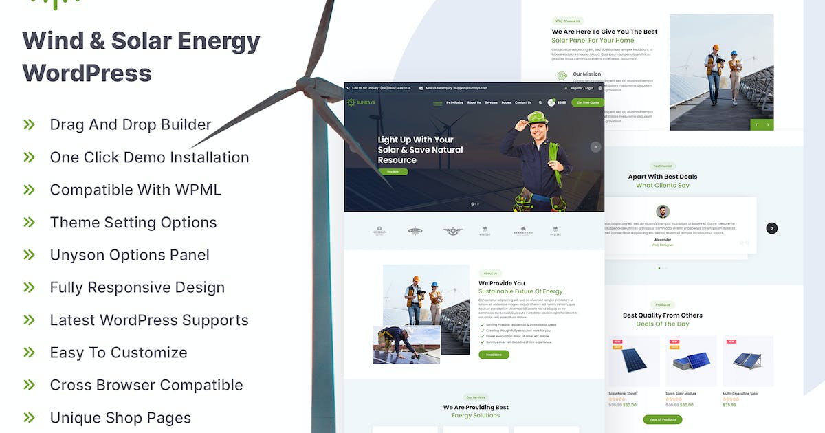 Sunrays – WordPress Theme is highly suitable for all Eco-friendly businesses. We are very delight to introduce Sunrays WordPress Theme which developed specifically for all types of Solar industry like solar power, wind power, hydropower, geothermal energy, biomass, biofuels, etc… Keeping an eye on changing the behavior of humans to adapt to Eco-friendly resources, We have come up with Sunrays – Solar Power & Renewable Green Energy WordPress to satisfy the requirements of industries by having professional websites in the easiest way possible. Sunrays – Solar Power & Renewable Green Energy WordPress has a clean design and developed to work for the solar industries like solar panel manufacturers and distributors, environment protection communities, renewable energy producers, environment protection firms, etc. Core Features: Drag And Drop BuilderOne-Click Demo InstallationCompatible With WPMLTheme Setting OptionsUnyson Options PanelFully Responsive DesignLatest WordPress SupportsEasy To CustomizeCross-Browser CompatibleUnique Shop PagesAnimation EffectsSEO FriendlyWooCommerce